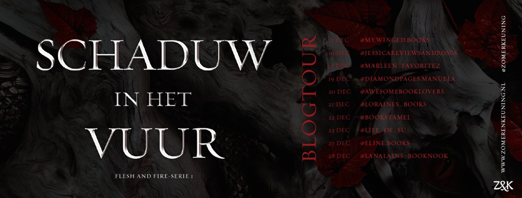 Vandaag mag ik de blogtour van Schaduw in het vuur van Zomer & Keuning aftrappen! Het boek was nét op tijd binnen om nog even een foto in daglicht te kunnen maken, vandaar dat mijn recensie wat later is. Ik had het boek al in bezit in het Engels. Maar omdat ik zo nieuwsgierig was hoe het verhaal van Poppy en Casteel verder ging, had ik stiekem niet zo veel zin om dit boek ‘tussendoor’ te moeten lezen. Toch raadde de auteur zelf aan om dit boek wel als 4de in de reeks te lezen, waarschijnlijk omdat er informatie in naar voren komt die benodigd is voor de rest van de serie. Dus uiteindelijk heb ik het boek tóch eerst gelezen voordat ik verder ging in de Blood & Ash serie. En vandaag vertel ik je erover of het de moeite waard was.