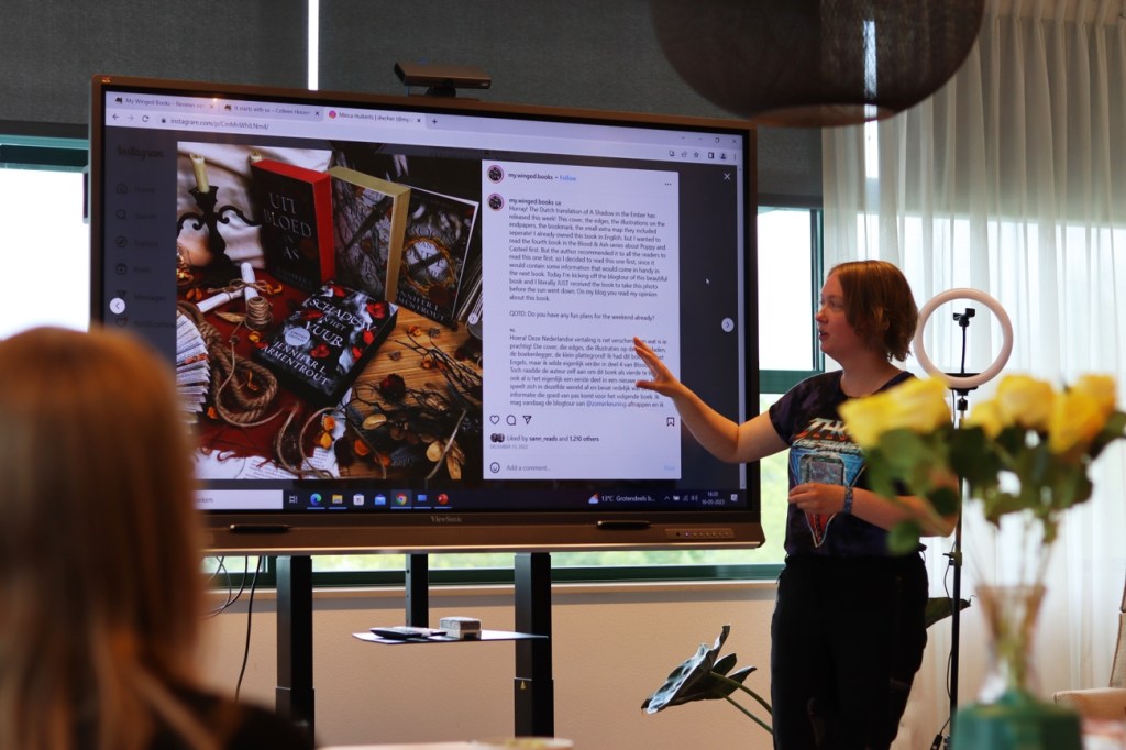 Eén onderdeel ervan mocht ik presenteren, namelijk het schrijven van recensies en het deelnemen aan blogtours. Ik had enkele links naar mijn blog en mijn Instagram-pagina toegestuurd voor in de PowerPoint en die dienden als leidraad. Nu moet ik dus toegeven dat ik veelal vertaalde fictie van Z&K heb gelezen en gerecenseerd, maar het was ontzettend leuk om mijn vrijwillige lees- en recenseerpassie over te brengen aan een tiental Nederlandstalige auteurs. Er werden leuke en interessante vragen gesteld aan mij en zo vloog mijn korte presentatie voorbij. Er werd door bij Barbara verteld over het ontwerpen van bijpassende covers en hoe dit door de jaren heen veranderd. En er werd nog een korte workshop gegeven over het maken van leuke foto’s voor social media.
